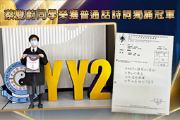 3E班蔡雙蔚同學早前參加第77屆香港學校朗誦節比賽,在中三、四年級女子詩詞獨誦(普通話)項目中獲得90分,榮獲冠軍,特此恭賀。