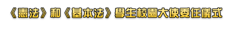 國民教育組於11月3日的早會上舉行「《憲法》和《基本法》學生校園大使委任儀式」,由校長親自頒發委任狀予各位校園大使,充分顯示了校方對該計劃的支持。本年度共有14位同學獲提名為《憲法》和《基本法》學生校園大使,名單如下: