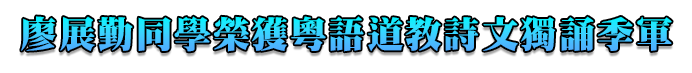 3A班廖展勤同學早前參加第77屆香港學校朗誦節比賽,在中三、四年級道教詩文作品朗誦(粵語)項目中榮獲季軍。評判莊如發先生在評語中表揚:「腔調、感情、節奏合詩旨」,這實是對廖同學的莫大肯定。