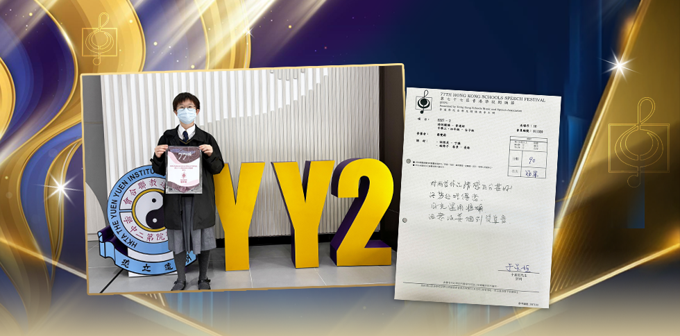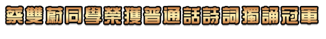 3E班蔡雙蔚同學早前參加第77屆香港學校朗誦節比賽,在中三、四年級女子詩詞獨誦(普通話)項目中獲得90分高分,榮獲冠軍。評判于星垣先生更在評語中寫道:「對兩首作品情感區分甚好!語勢處理得當,目光運用準確。」,這實是對蔡同學的一個莫大肯定。