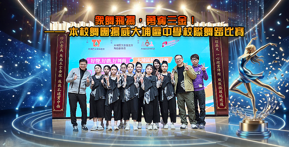 本校早前參加由大埔區文藝協進會主辦之「第44屆校際舞蹈比賽」,三組皆成功獲得三位評判青睞,同時勇奪金獎,成績亮麗。