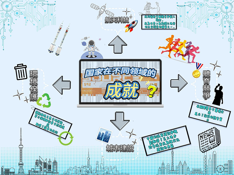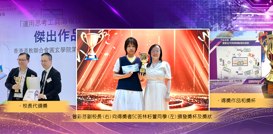 公民與社會發展科和視覺藝術科跨科合作,參加了由教育局舉辦的「慎思明辨學公民」比賽和「運用思考工具海報設計」作品選,5C班林籽萱同學以「國家在不同領域取得的成就」作設計和學習重點,於作品選中脫穎而出,獲得傑出作品獎,而經過各同學的努力,也於學習平台上獲得最積極參與學校獎,恭喜林同學!
