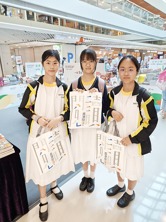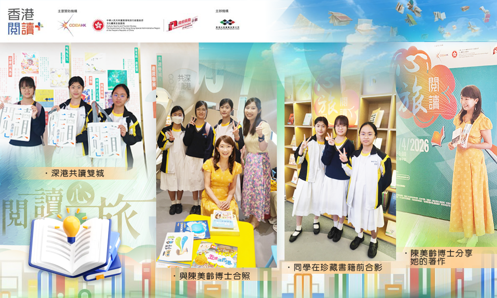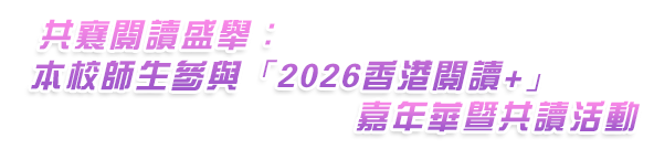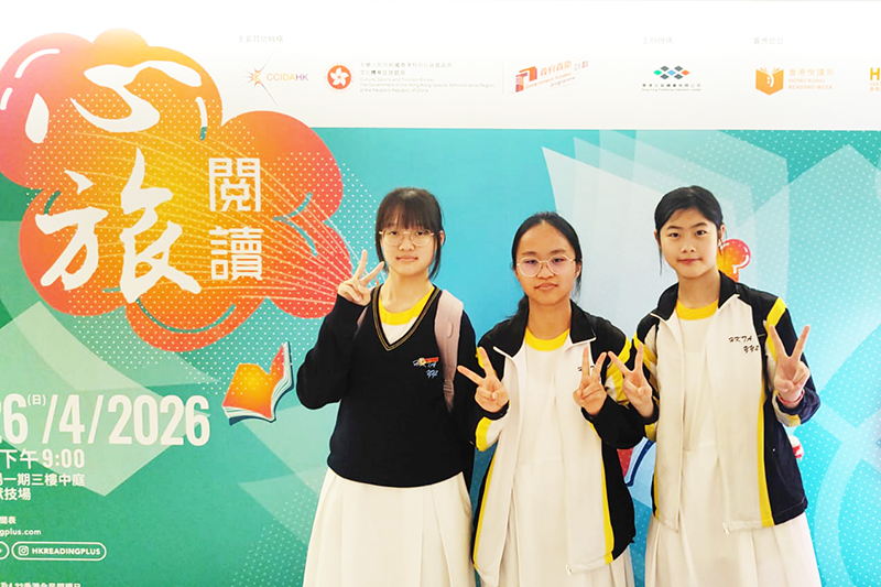 為響應2026年4月23日的「世界閱讀日」及「香港全民閱讀日」,本校圖書館組梁麗明老師帶領4A班梁卓盈同學、4B班劉映君同學及李芯柔同學出席由香港出版總會主辦的「2026香港閱讀+」閱讀嘉年華會。當天,本校師生與廣大市民齊集於沙田新城市廣場「共讀點」,一起參與「共讀半小時」活動,沉浸於全城閱讀的濃厚氣氛中。
