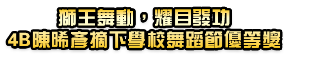 4B陳晞彥早前參加一年一度的學界舞蹈盛事 — 第62屆學校舞蹈節,憑民間舞「獅兄! 趣遊記!」連下兩城,勇奪中國舞中學獨舞組優等獎及編舞獎,表現耀眼光芒。陳同學此舞集創意、技藝及文化意涵於一身,評判高度評價,指其舞蹈帶故事性,由雄獅睡醒至拿酒瓶的過程,展現風趣的情味,全程以舞獅融入舞蹈,呈現極高的戲劇效果。